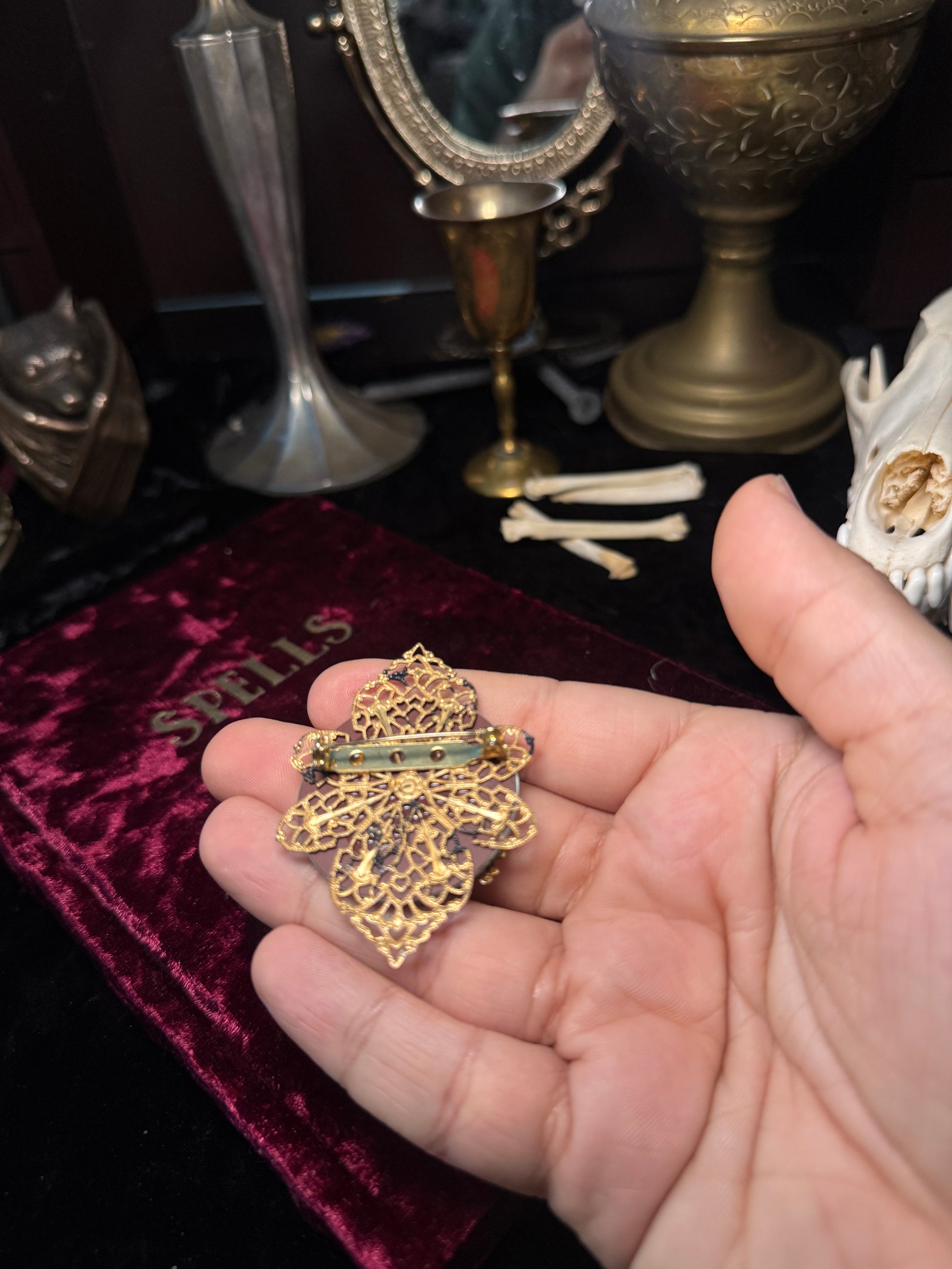 One of my most unique finds; this brooch features divine cherubs amongst an ornate gold design. Set in the center is a mirrored glass. To me this brooch reflects our own divinity back to us.